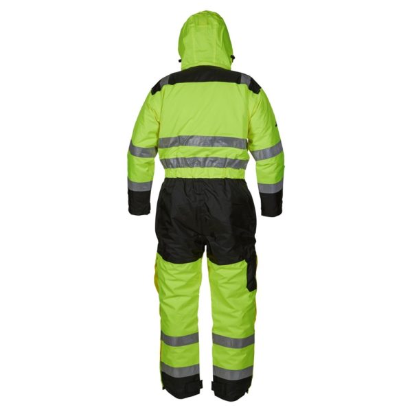 Vattert kjeledress i høy synlighet ISO20471 kl. 3 med 180 gr/m2 vattering. Ytterstoff i PU-belagt polyester med vannsøyle 3000 mm. Tapede sømmer for å unngå vanngjennomtrengning. Pustende materiale. Stor avtakbar hette, ribbestrikk i erme, strikk i ryggen, stor stormlomme bak klaff, stikklommer, to brystlommer, ID-kortlomme og refleks over skuldre. En prisgunstig og allsidig dress til arbeid i traffikerte områder, vedlikeholdsarbeid, bygg- og anlegg.