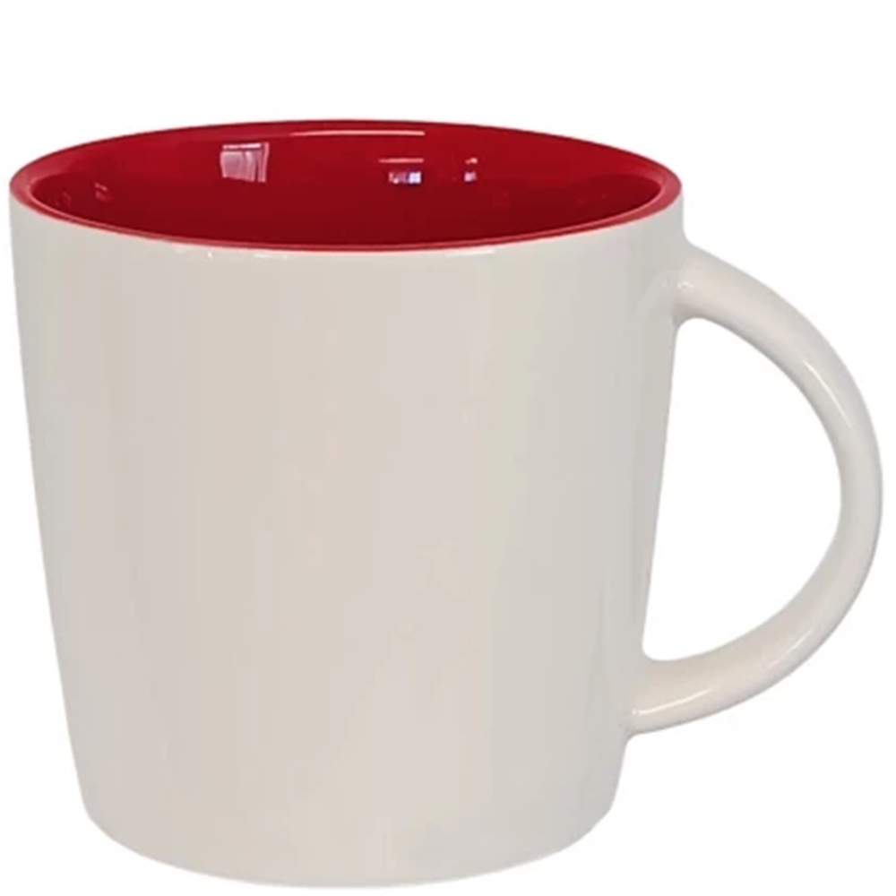 Populært krus med lett koning. Stor dekorflate helt fra bunnen og opp til kanten! Leveres i flere fargekombinasjoner.