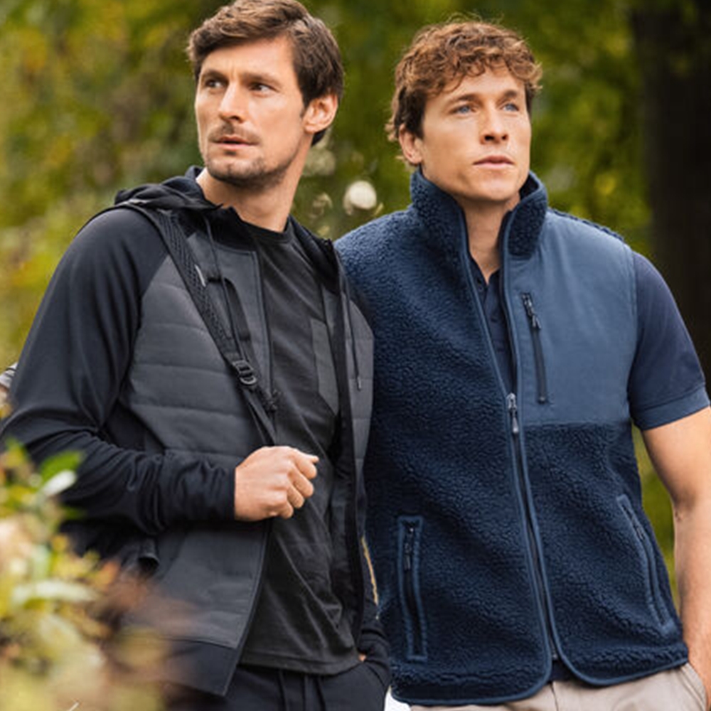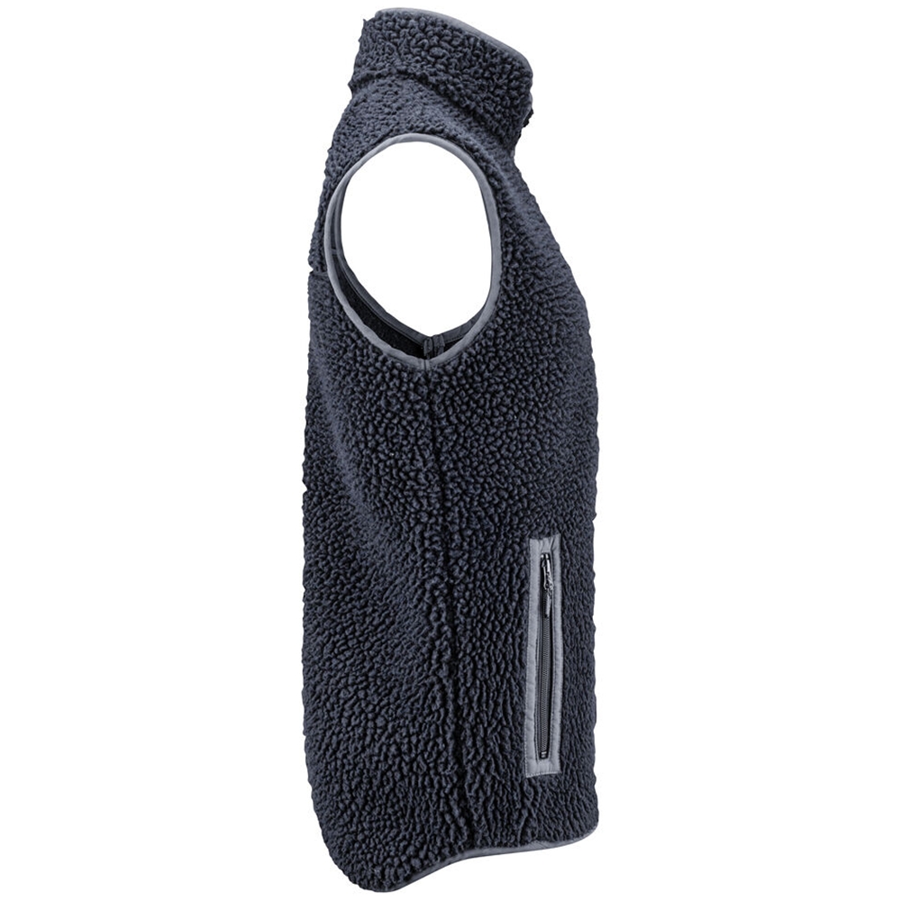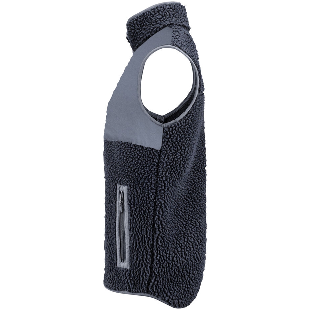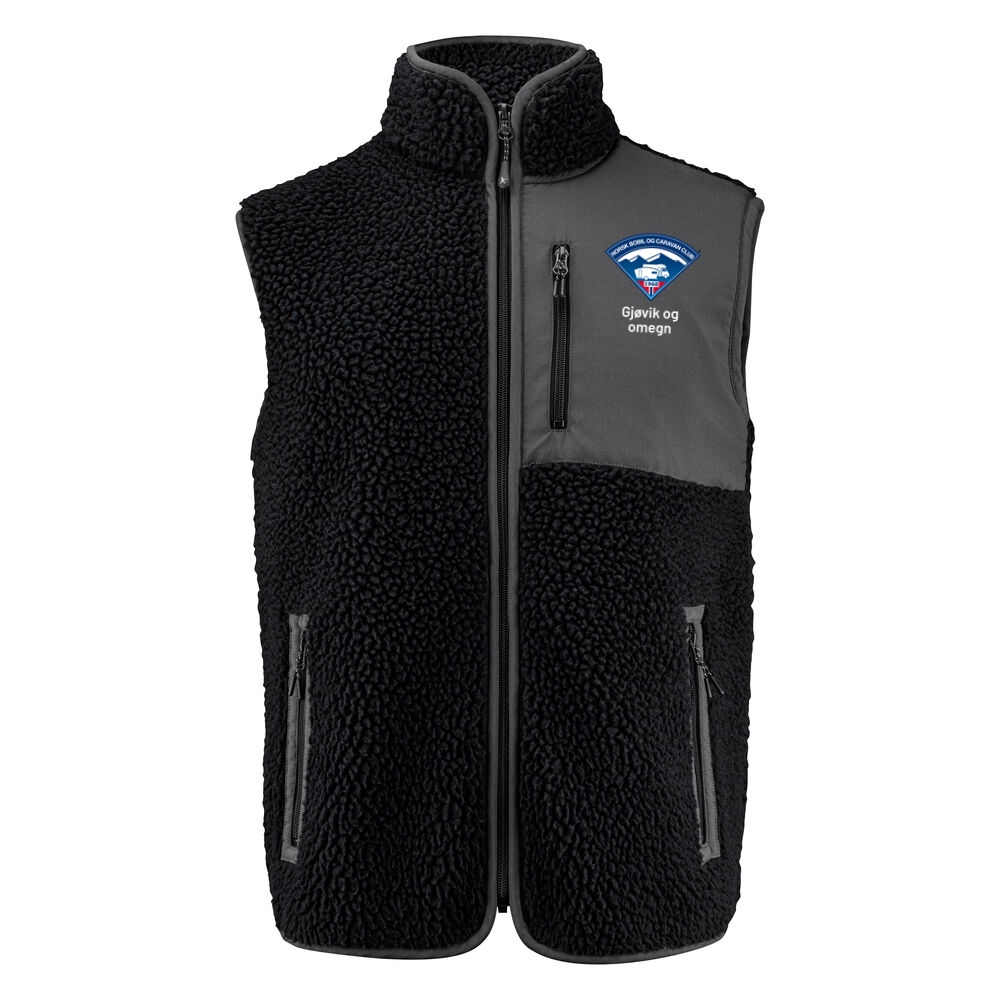 Tofarget fleecevest med kontrastmateriale på brystet, samt passepoil langs kanten på sømmene. Brystlomme og sidelommer med glidelås. Fleecevesten er pakket i en komposterbar polypose.