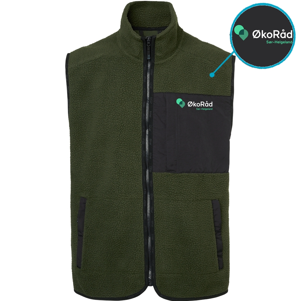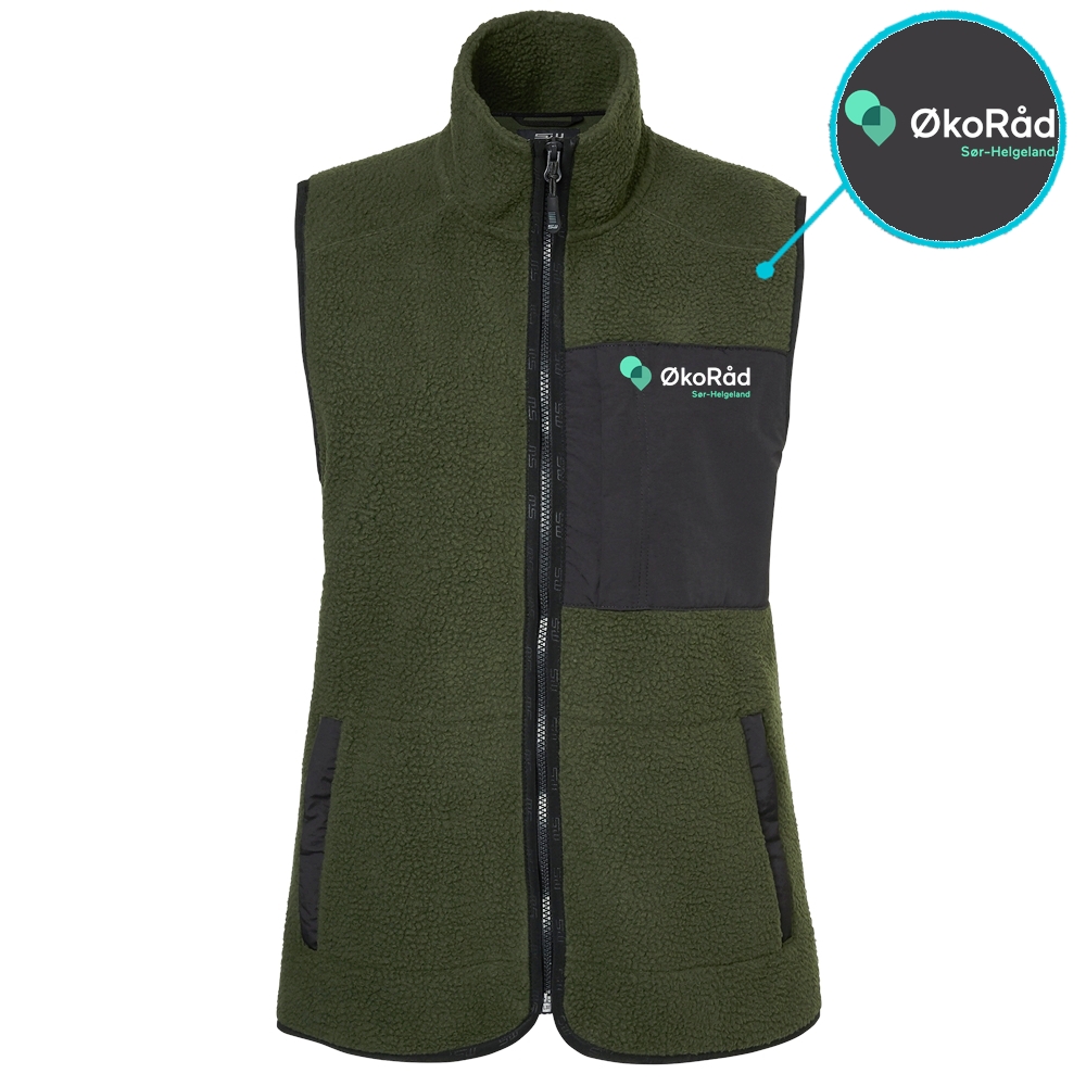 Vesten i sherpafleece har en tettsittende dampform med myk innside og luftig utside. Utstyrt med to sidelommer, passpoallommer og en brystlomme med glidelås. Svarte vevde paneler, avrundet bakkant og diskret SW-bånd i enden av plagget.
