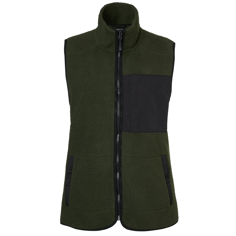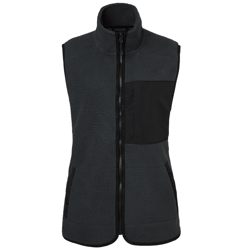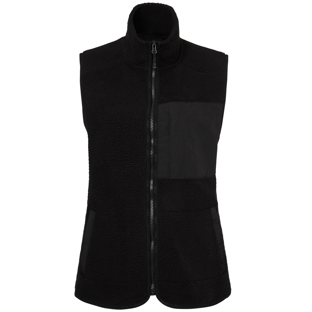 Vesten i sherpafleece har en tettsittende dampform med myk innside og luftig utside. Utstyrt med to sidelommer, passpoallommer og en brystlomme med glidelås. Svarte vevde paneler, avrundet bakkant og diskret SW-bånd i enden av plagget.