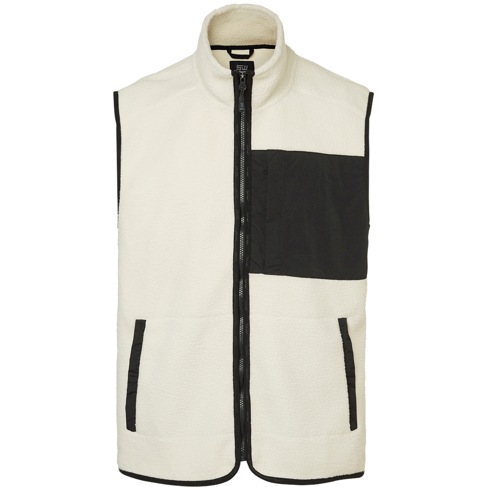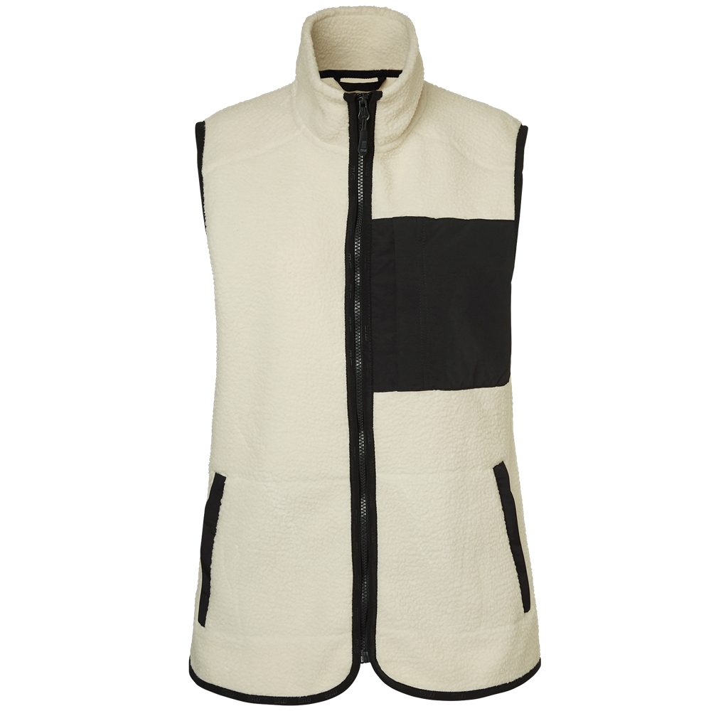 Vesten i sherpafleece har en tettsittende dampform med myk innside og luftig utside. Utstyrt med to sidelommer, passpoallommer og en brystlomme med glidelås. Svarte vevde paneler, avrundet bakkant og diskret SW-bånd i enden av plagget.