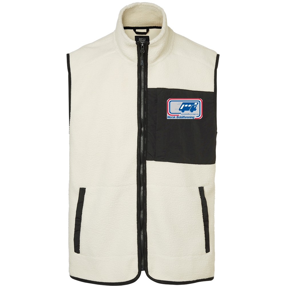 Vesten i sherpafleece har en tettsittende dampform med myk innside og luftig utside. Utstyrt med to sidelommer, passpoallommer og en brystlomme med glidelås. Svarte vevde paneler, avrundet bakkant og diskret SW-bånd i enden av plagget.